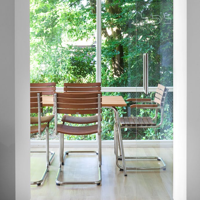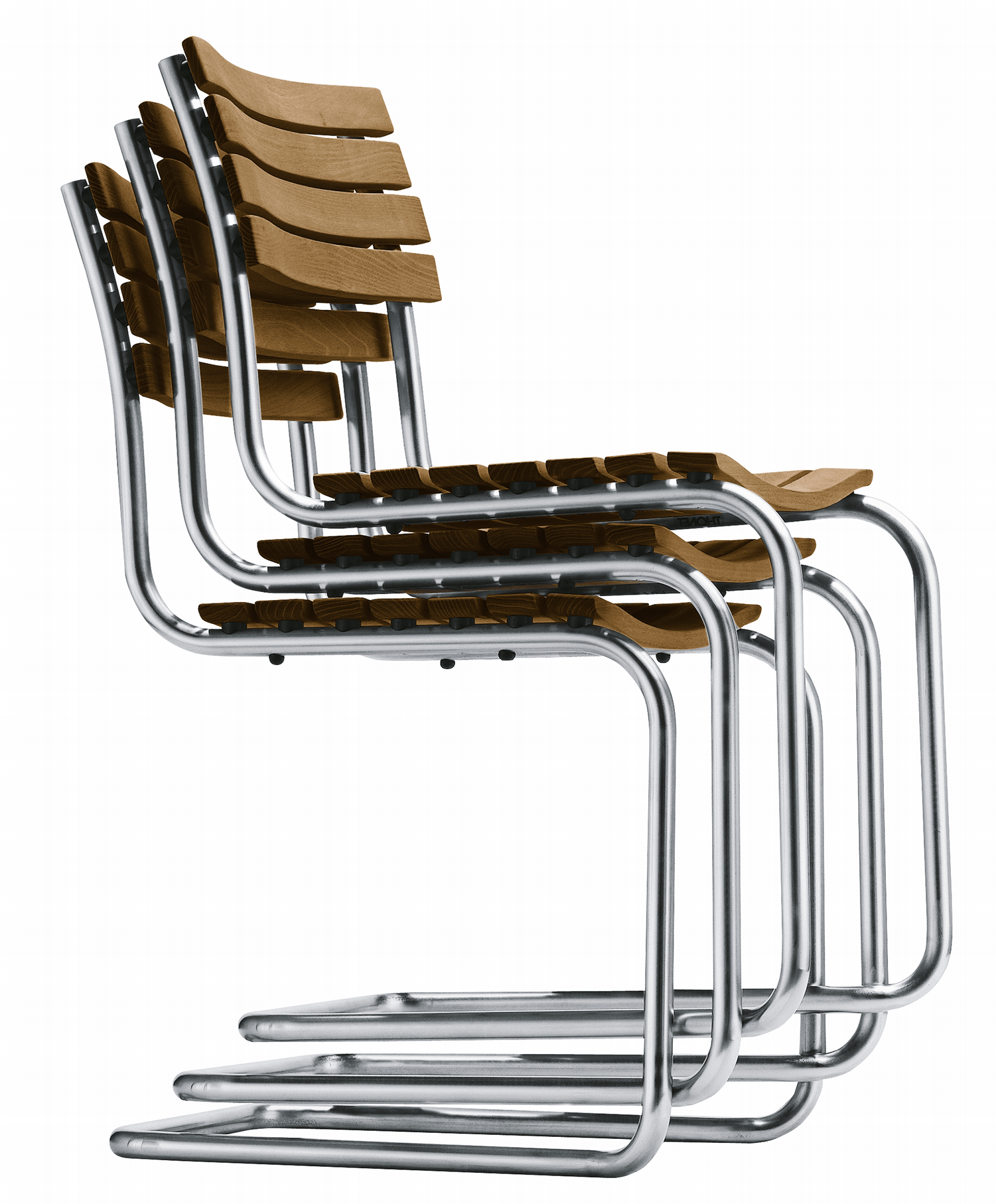 Garden chairs that correspond in construction and design to the classic S 43 by Mart Stam: clear and restrained in shape, with optimum seating comfort and high quality in terms of material and workmanship. These chairs were shown for the first time in the 1935 Thonet catalog under the model designation B 33 g (g = garden). Today the wooden strips are made of solid Iroko, an African wood with high density and weather resistance (FSC seal). It looks similar to teak and has a smooth, even surface. All wooden parts are oiled by us for protection. The S 1040 table goes well with this.