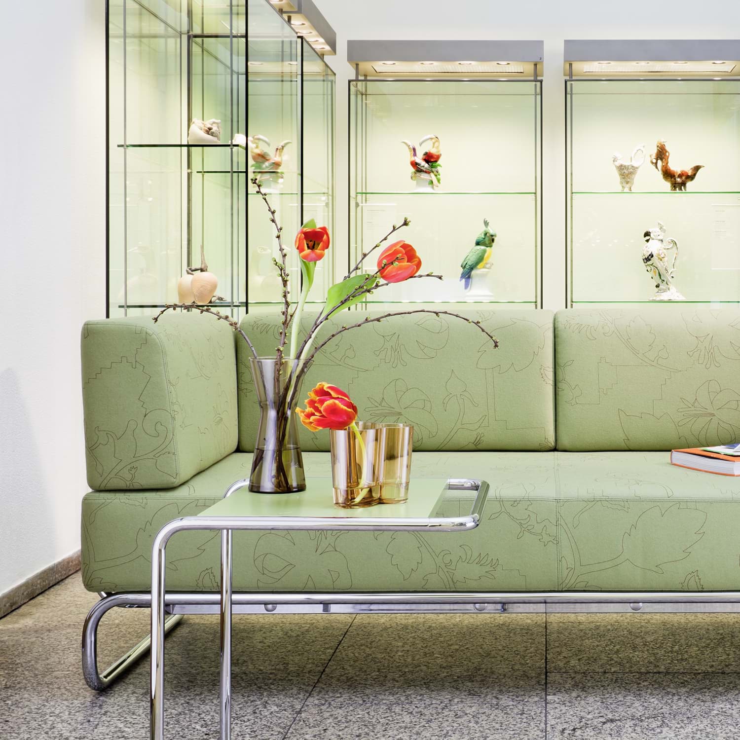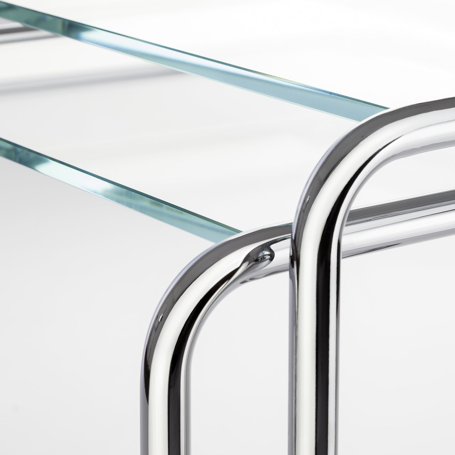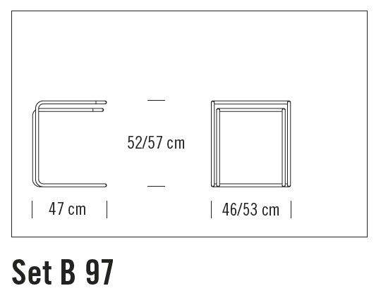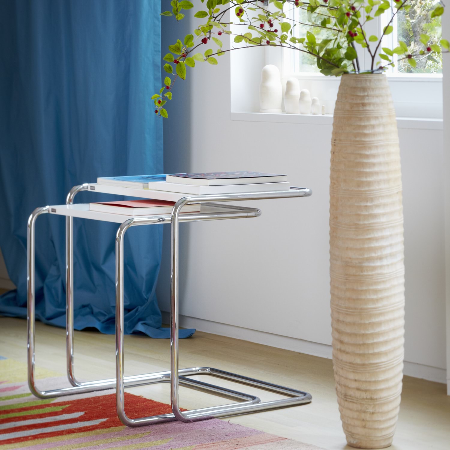 Elegant, flexible and suitable for a variety of uses. In its dimensions, the table set B 97 is reminiscent of Marcel Breuer’s nesting table B 9. Its altered construction, however, offers a practical advantage: due to the opening on one side, the tables can be pulled over the edge of a sofa, armchair or bed. Otherwise, they can be conveniently pushed into one another. The Thonet design from 1933 is among the classics of tubular steel furniture.