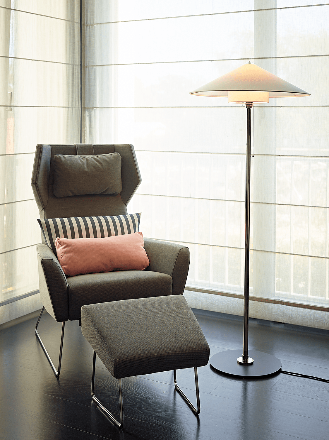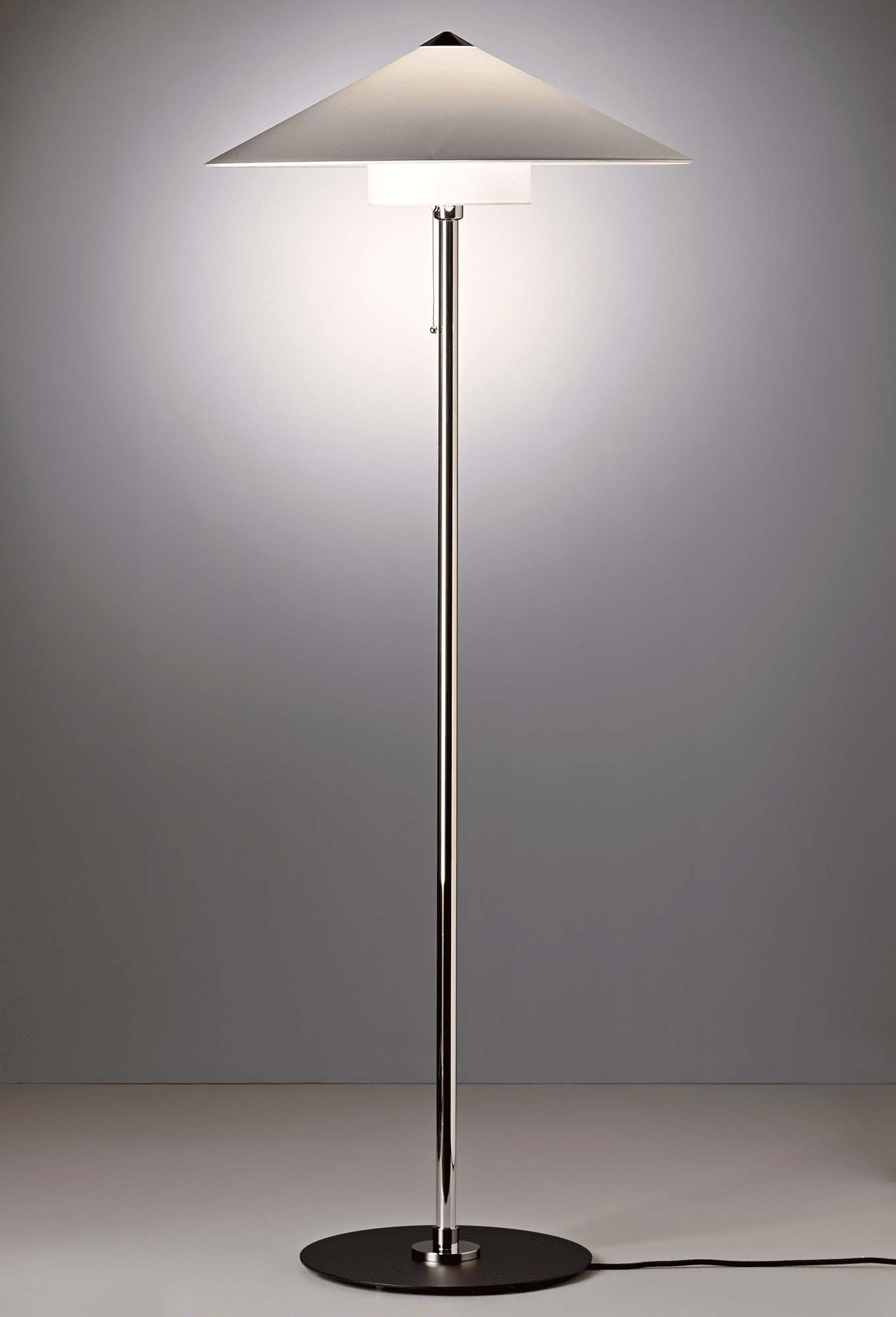 Two years later, the pioneer of industrial design Wilhelm Wagenfeld created this floor lamp to match the popular table lamp. The new edition of the lamp, which was created in 1930, now has a heat-resistant plastic shade covered with fabric (chintz). This only reedition protected by copyright and authorised by Prof. Wilhelm Wagenfeld bears the Tecnolumen logo.