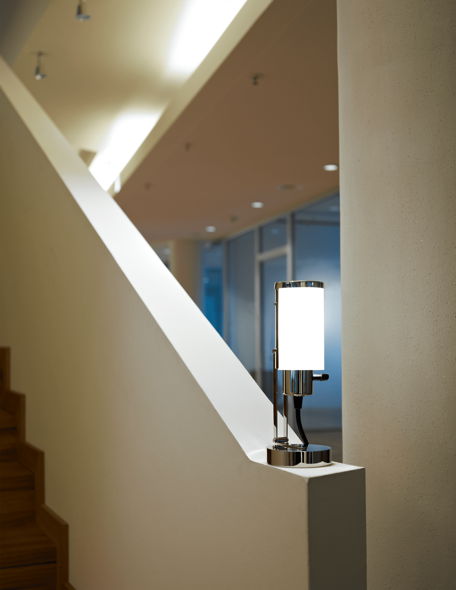 Designed in 1930 by Wilhelm Wagenfeld, the WNL 30 was conceived as a multi-purpose luminaire and, thanks to its minimalist design, does not need to shy away from confrontation with "modern" lamps. Wagenfeld, whose educational and professional career ranges from attending the School of Applied Arts and Bauhaus workshop to teaching at universities and leading positions in glass works and metal workshops, created a number of his most successful works as early as the end of the 1920s.