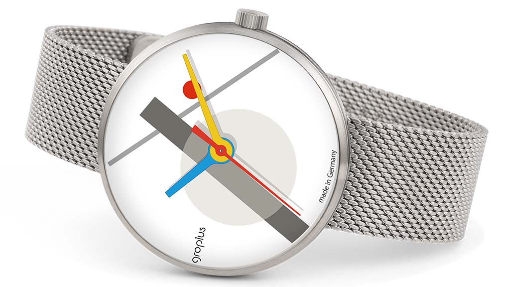 HOMMAGE À MOHOLY-NAGY collection was inspired by the collages of Moholy-Nagy of the 1920s. The design of the dials is arranged in such a way that the hands seem to be abstract and representative of the founding year 1919 at 19:19 CET.