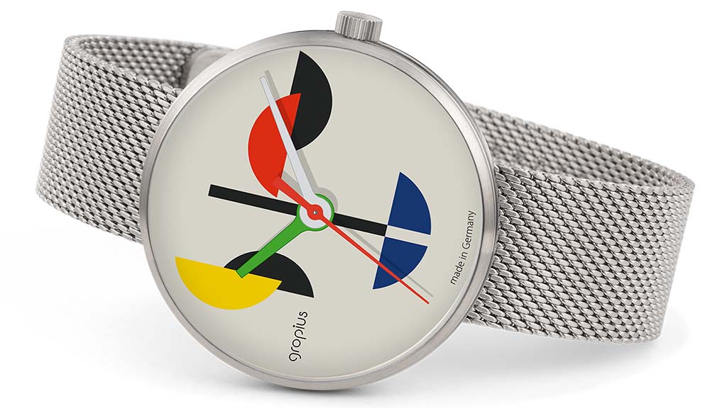 In analogy to the triadic ballet of Oskar Schlemmer, designer Daniel Eltner composed these abstract segments of Moholy-Nagy into a face: speaking, seeing and hearing were reflected with the stylistic device of irony. This watch design is also a tribute to Daniel Eltner's friend Alessandro Mendini, the famous Italian designer who was an ardent Bauhaus admirer.