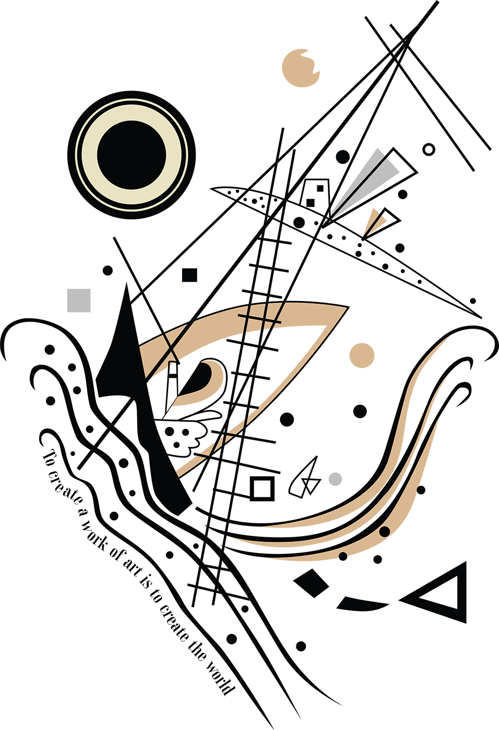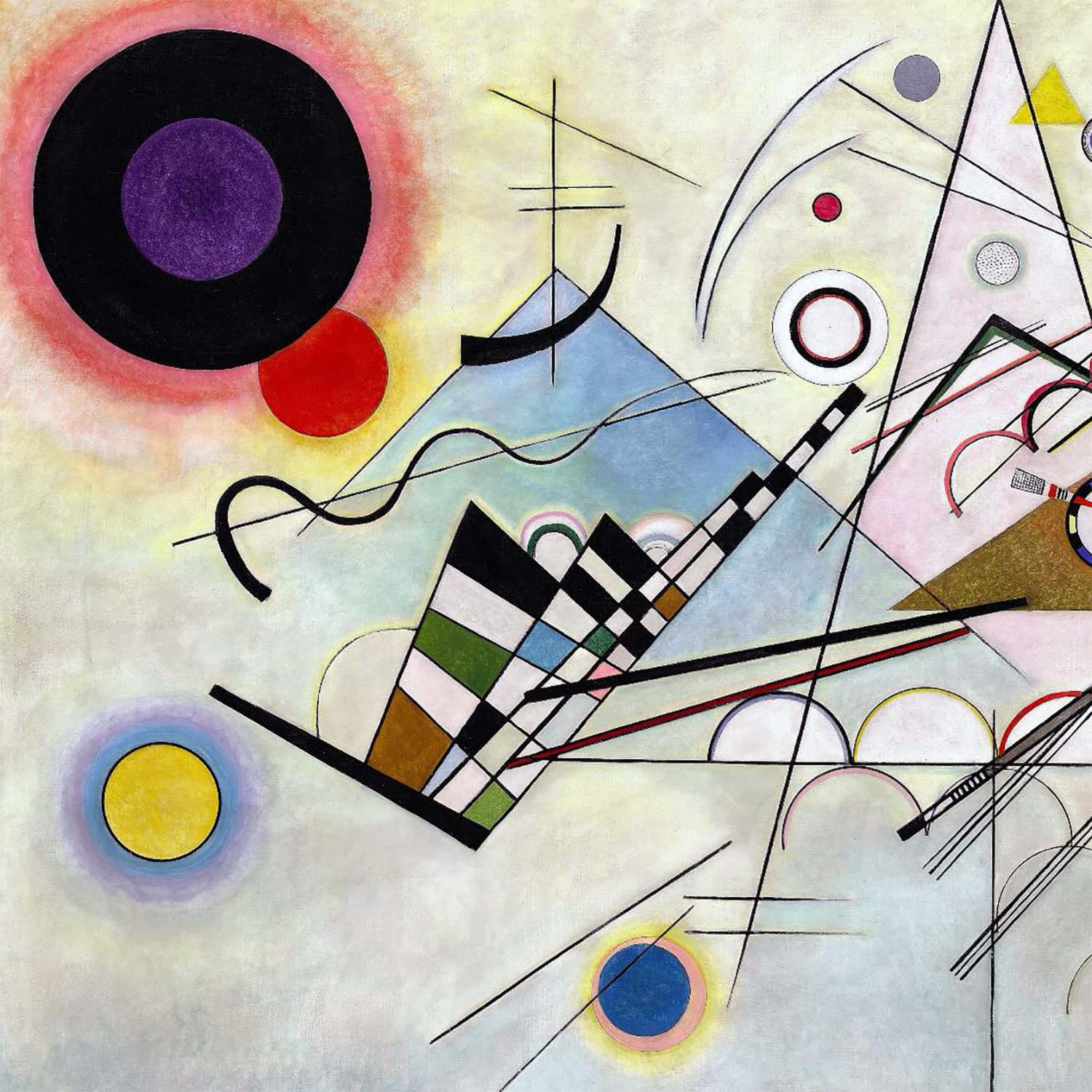 In 1921, Kandinsky became a teacher at the Weimar Bauhaus, invited by Walter Gropius and moved to Berlin with his wife, Nina. During his time at the Bauhaus school, geometric elements such as circles, half-circles, straight lines and triangles became the focus of his artistic philosophy, as he moved towards his constructively organized compositions.